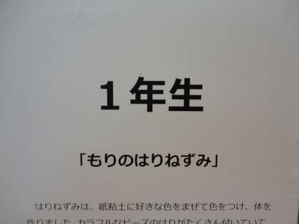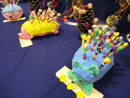 1年生の作品です。「もりのはりねずみ」紙粘土のボディに、ビーズの針がとてもかわいいです。
