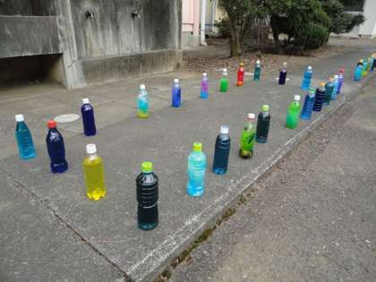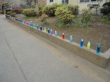 色水やお花紙を入れたきれいなペットボトル作品です。日差しを受けてキラキラしていました。