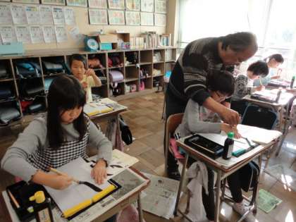 4の1では、毛筆の授業をしていました。