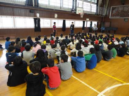 終業式後に、4年生が学年集会をしていました。今日で転校してしまうお友達にエールを送っていました。