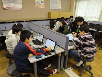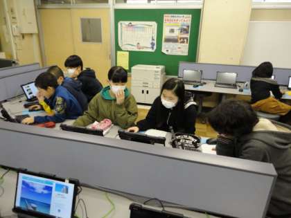 パソコンルームでは、6年2組が、社会で、世界の国調べをしていました。興味を持った国を紹介するために、調べていました。