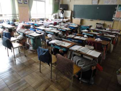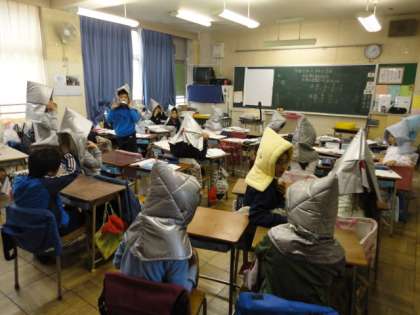 12日、2月の避難訓練を実施しました。子供たちが机の下にもぐっています。揺れがおさまり、防災頭巾をかぶって避難開始です。