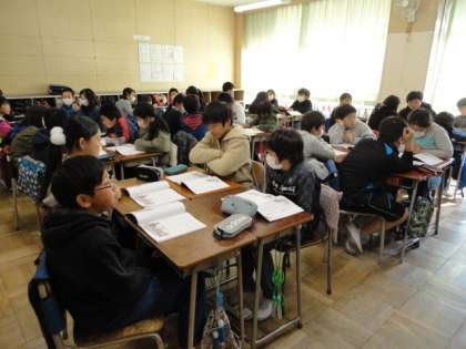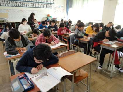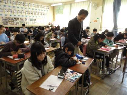 写真は、6年生の授業風景です。中学校の校長先生も、熱心に見てくださっていました。