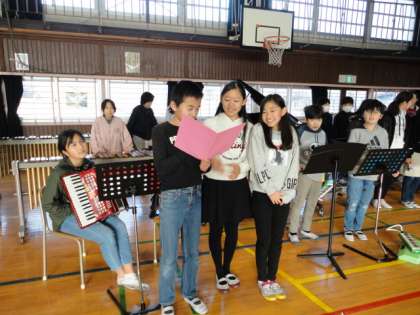 2月14日、音楽集会が開かれました。まず初めに、音楽委員会の子どもたちが、始めの言葉を言いました。