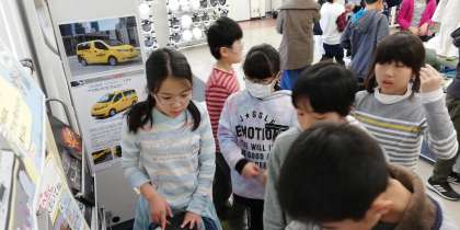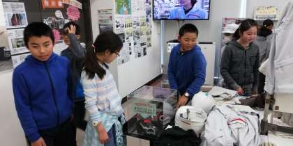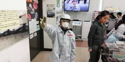 工場見学から戻ってきました。ホールの体験コーナーで、安全靴や作業服など着ています。