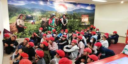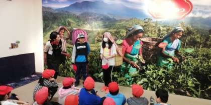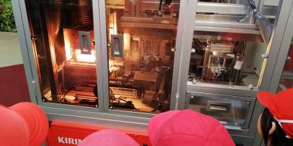 ペットボトルを成形する機械で、実際に膨らませる瞬間を見ました。茶葉摘みの格好もしました。