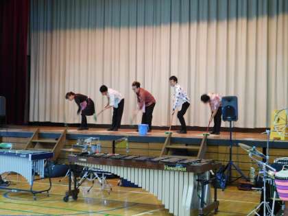 体育館を歩いてのパフォーマンス、デッキブラシを使ったリズム演奏、どれも一流です。