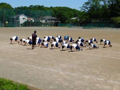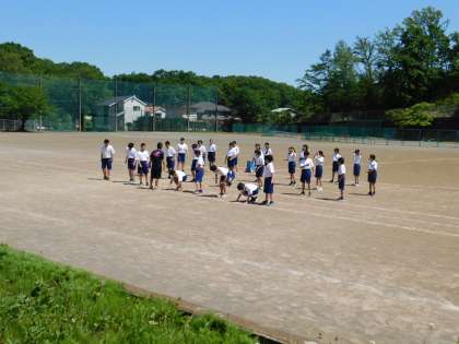 5月8日、小中一貫教育の取組で、小学校の先生方が城山中学校を訪れました。写真は1年生の体育の授業です。
