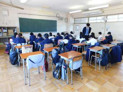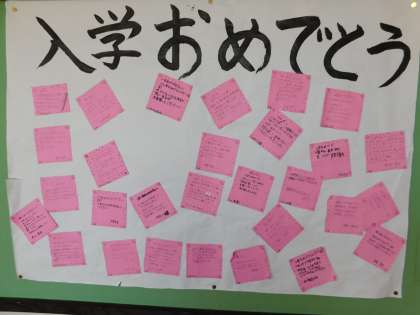 1年生の教室では英語の授業中でした。廊下には上級生が書いた歓迎カードが貼られていました。