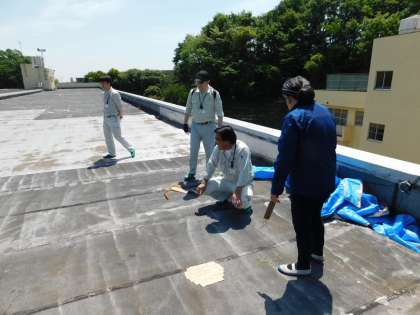 3階の雨漏りに、市から職員の皆さんが来て補修作業をしてくれました。