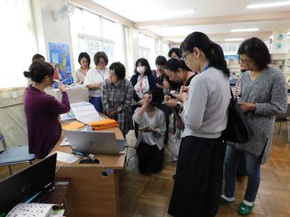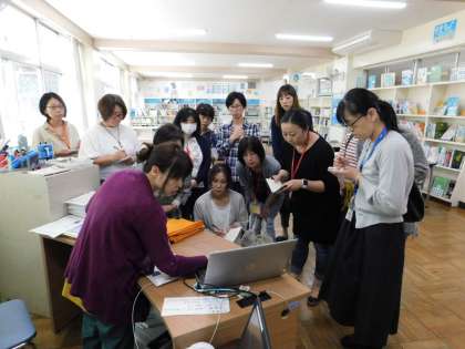 図書ボランティアの皆さんが、貸し出し用の端末機器の操作法を、学校司書の先生から教わっています。図書委員の子たちのサポートをしてくださいます。