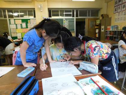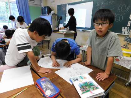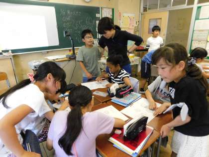 4年1組では、分度器の使い方を学んでいました。教えあい、学びあいの学習で楽しそうでした。
