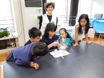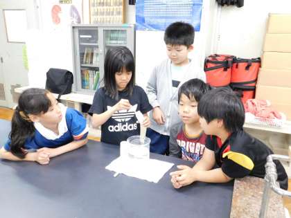 子供たちは、簡易実験を通して、水道水がいかにして作られるかを学びます。