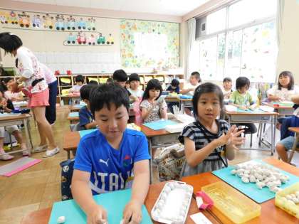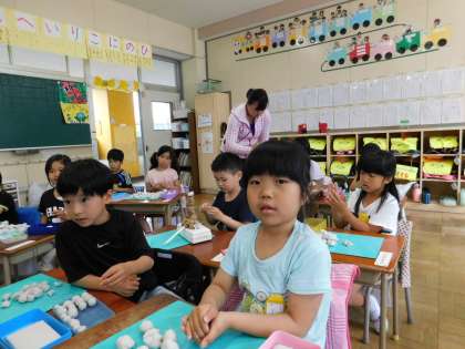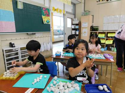 粘土でお団子を作っていました。上手に丸く作るのは、意外と難しい作業です。