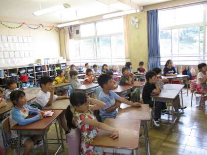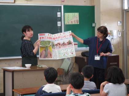 5月16日、2年生が食育授業の一つとして、グリーンピースのさやむきをしました。
