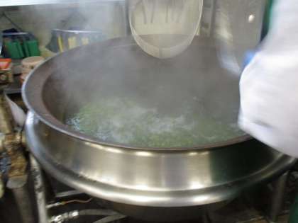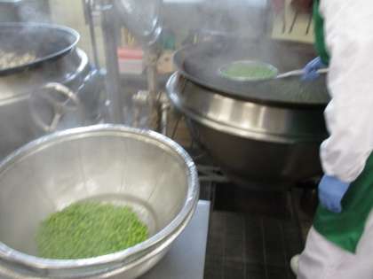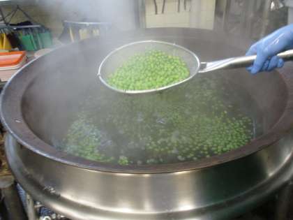 子供たちがむいてくれたグリーンピースは、この日の給食に使われました。調理員さんが、茹でています。