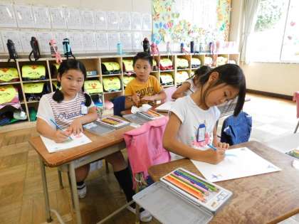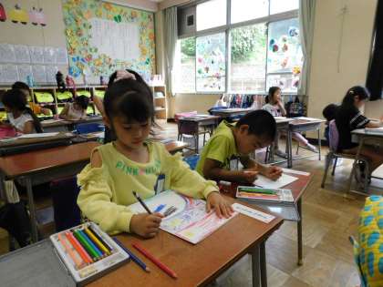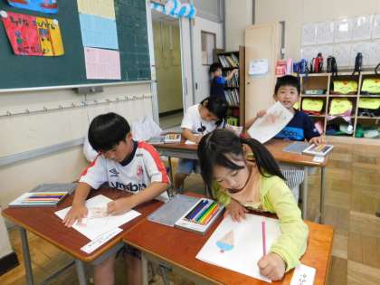 1年生の授業風景です。Tシャツ100選に出品するため、1年生が思い浮かべた絵を描いていました。