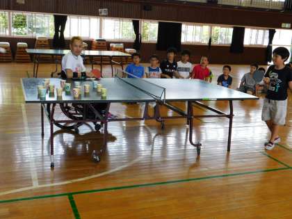 コップはたくさん並んでいますが、当てるのは、なかなか難しいようです。0点や×2、マイナス点など、ハラハラドキドキのゲームでした。