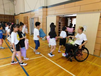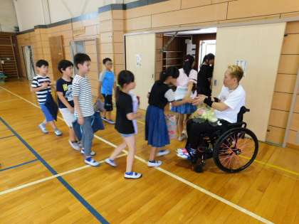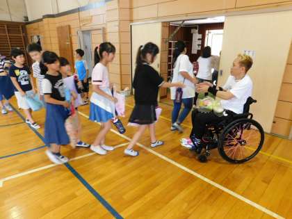 体育館を出る子供たちと吉田選手が握手をしてお別れです。