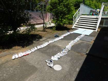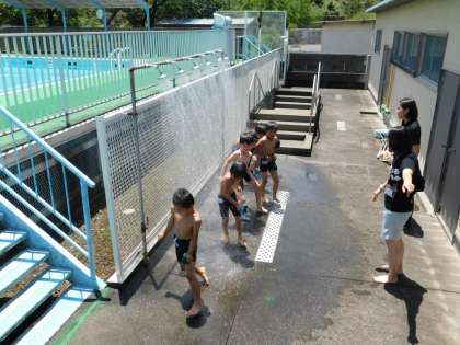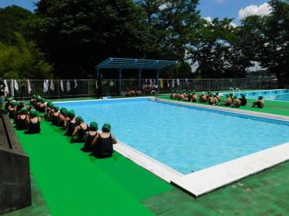 18日も天気が良かったです。今日は1年生が水着に着替えて、プールの授業の流れを勉強しました。水泳は命にかかわる授業です。ルールなど、しっかり覚えて入ります。