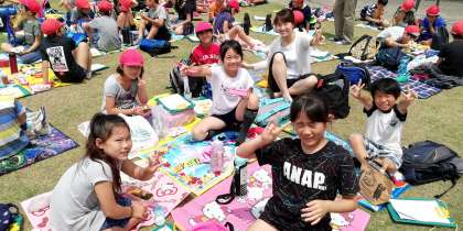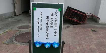 お弁当は由井第一小学校の芝生校庭をお借りしました。校長先生、副校長先生に出迎えていただきました。また、児童会の子達も歓迎の言葉で迎えてくれました。