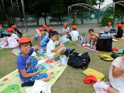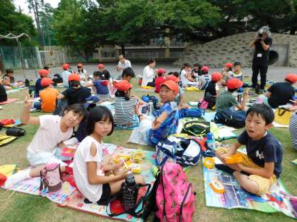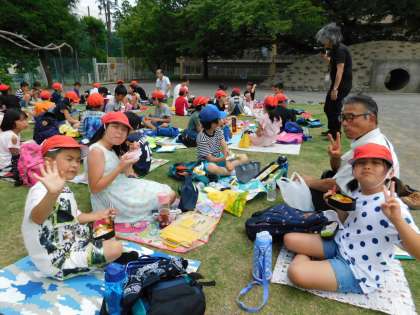 先生たちも一緒に芝生でお弁当です。
