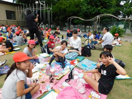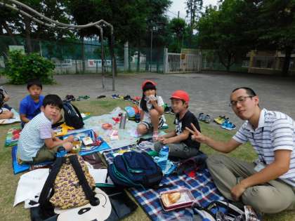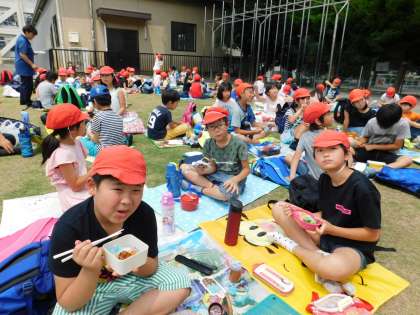 みんな笑顔でお弁当を食べています。