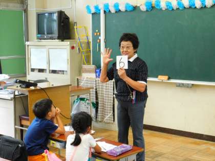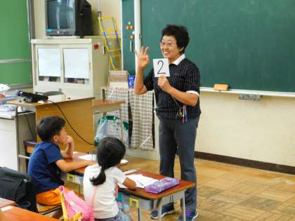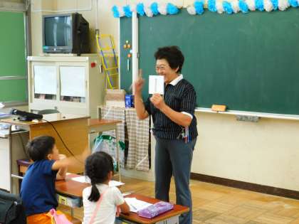 1年2組の様子です。先生がプリントを印刷してる間、専門員の先生が、フラッシュカードを使って指導してくれていました。