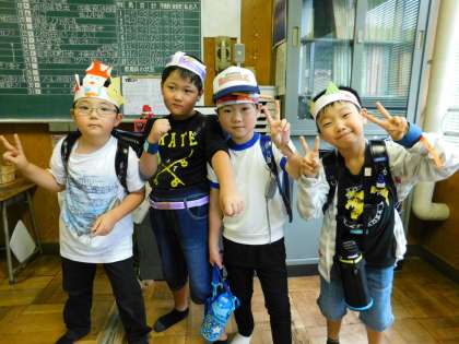 放課後、2年1組の男の子たちが、図工で作った作品を見せに来てくれました。よく似合ってます。