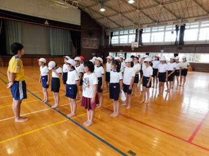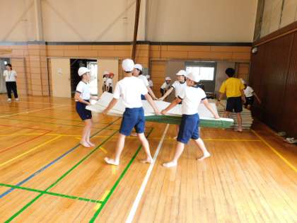 体育館で、5年1組がマット運動の授業をしていました。マットの運び方もしっかりできています。