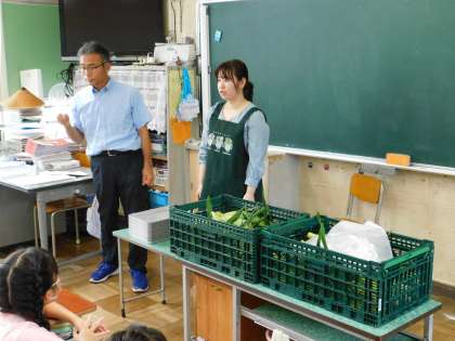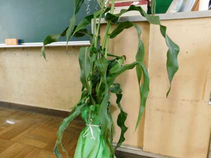 7月18日、3年生がトウモロコシの皮むき体験をしました。トウモロコシの茎もあります。
