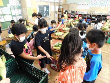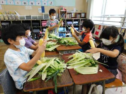 早くむき終わった子は、3本目に挑戦です。もちろん、この日の給食には、おいしいトウモロコシが出ました。3年生ご苦労様でした。ありがとう。