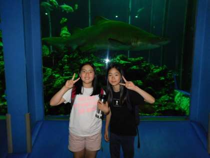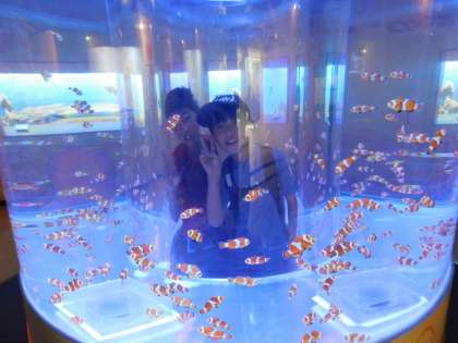 大きなサメをバックにしたり、ニモで有名なカクレクマノミの水槽の中心に入り込んで写真を撮ったりしました。