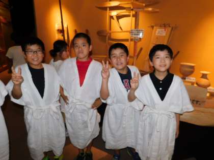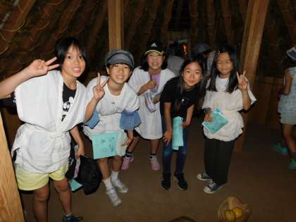 博物館から、30分ほどで登呂遺跡につきました。まずは登呂博物館の中を見学します。弥生人の服装を体験しました。