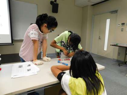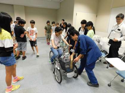 まず初めに、「小さな力で大きな力を生み出す」学習をしました。歯車を組み合わせ、重いものを簡単に持ち上げました。乾電池で動く自転車にも乗りました。