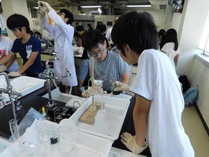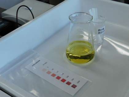鉄が溶けた水溶液を、水道に流せるくらいにきれいにしていきます。まずは、溶けた鉄を個体に戻す作業をして、ろ紙でとりのぞきました。