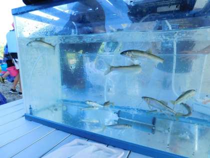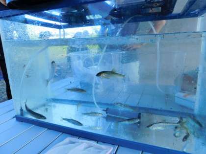 事前に漁協の方が投網で魚を捕まえてくれました。カワムツ、オイカワ、ウグイ、何といってもアユがいっぱいいるのが嬉しかったです。