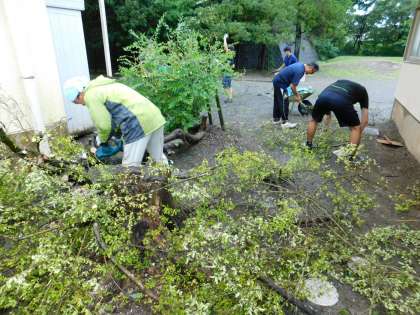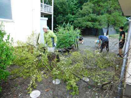 台風15号は、学校にもしっかりと余波を残していきました。校庭トイレ横の木が根元から折れたのを、朝のうちに教職員で片づけました。また、いがぐりも落ちていたのを拾いました。