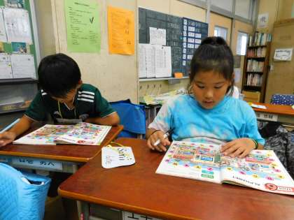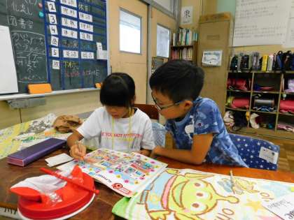 テキストの絵の中に隠されたアルファベットを、探す作業をしています。友達と協力してる風景も見られます。