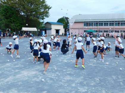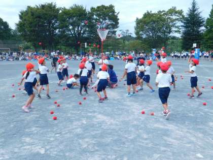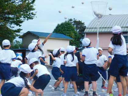 踊りタイムが終わると、かごに向かって玉を投げいれます。