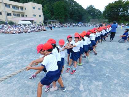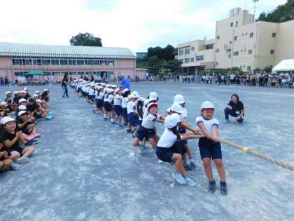 最後の競技は、プログラム24番、全校児童による「おっかけ綱引き」です。まず初めは、1・2年生が普通の綱引きを行いました。