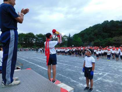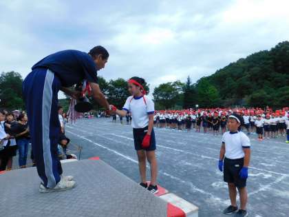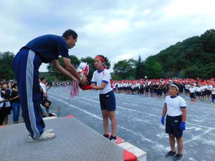 赤組応援団長に、優勝カップが渡されました。
