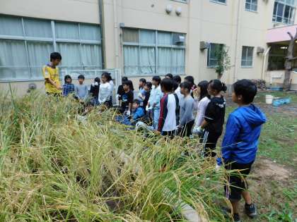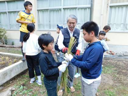 学校運営協議会の方も来て、手伝ってくださいました。鎌の取り扱いの注意事項も先生がしっかり指導しています。