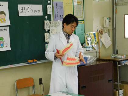 当日は、養護の先生だけでなく、歯科校医の先生にも、正しい歯の磨き方をご指導いただきました。