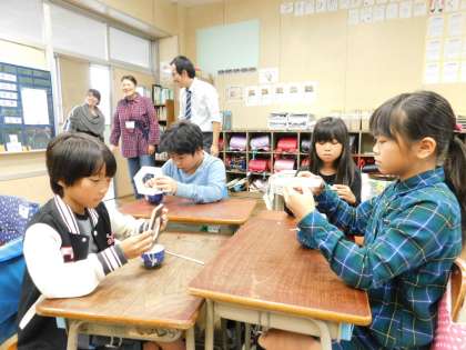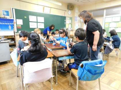 3年2組は総合学習で、まゆの糸取をしていました。学運協の浜口さんも学習ボランティアとして来てくださっていました。