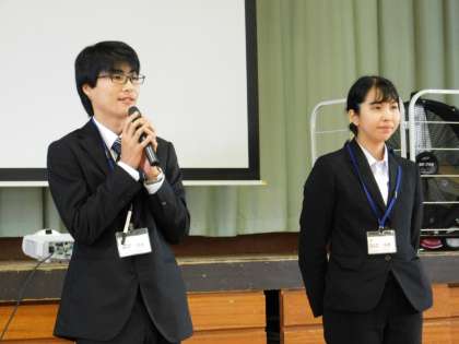 10月21日(月)、前週で実習の終わった2人が、全校児童にお別れの挨拶をしに来てくれました。