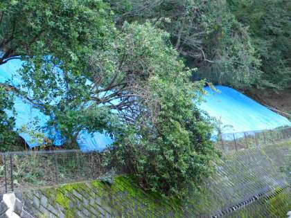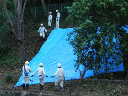 25日の大雨の前に、施設管理課の方がシートのかけ直しをしてくださいました。25日にも、大雨の中、学校を見に来てくれました。ありがとうございます。