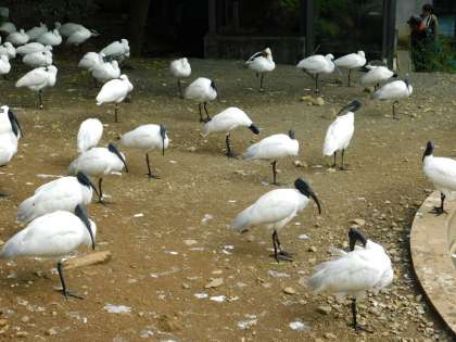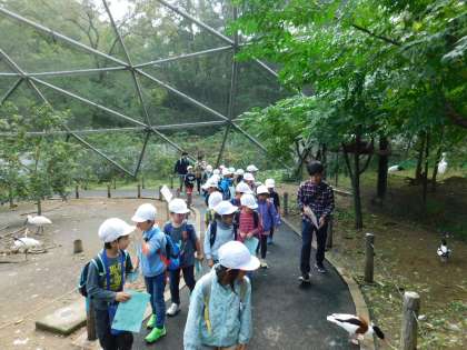 グループ行動が終わり、学級ごとの見学が始まりました。まずはウォークイン・バードゲージで、様々な鳥を見ました。