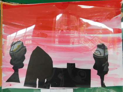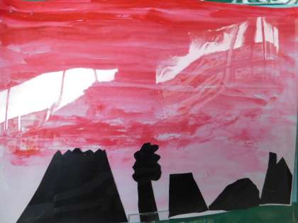 1年生の図工作品です。題名は「夕焼けの空に」です。