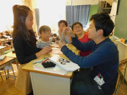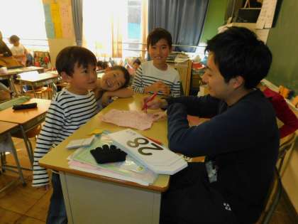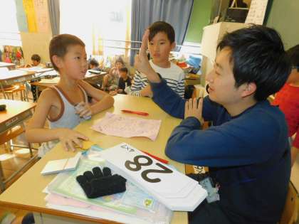2年3組では、かけ算九九の確かめ中です。一人ひとりが、先生に確かめてもらっています。この後、校長も入り、九九の確かめをさせてもらいました。みんな頑張ってます。